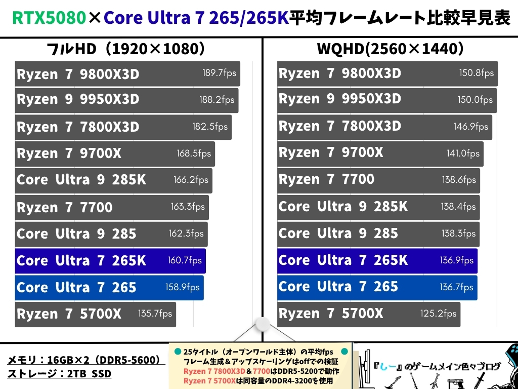 Core Ultra 7 265 / 265KとRTX5080の組み合わせで人気ゲーム25タイトルの平均フレームレートを検証し、Ryzen 7 9800X3DやRyzen 7 9700Xと比較して表にしました。