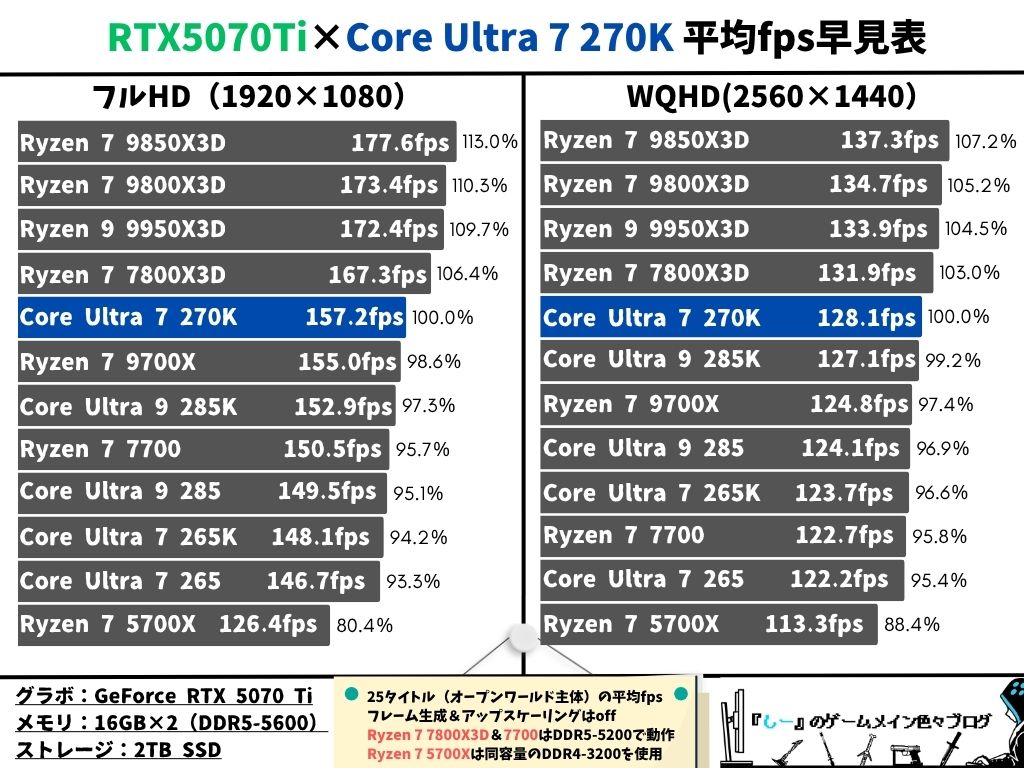 Core Ultra 7 270K PlusとRTX5070Tiの組み合わせで人気ゲーム25タイトルの平均フレームレートを検証し、Ryzen 7 9800X3DやRyzen 7 9700Xと比較して表にしました。