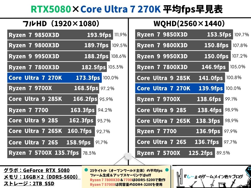 Core Ultra 7 270K PlusとRTX5080の組み合わせで人気ゲーム25タイトルの平均フレームレートを検証し、Ryzen 7 9850X3DやRyzen 9 9950X3Dと比較して表にしました。