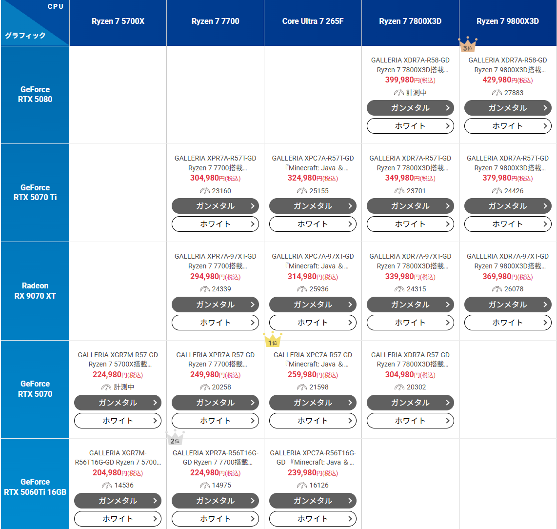 | グラボ | RTX5070 | RTX5070 | RX9070XT | RX9070XT | RTX5070Ti | RTX5070Ti | RTX5080 |