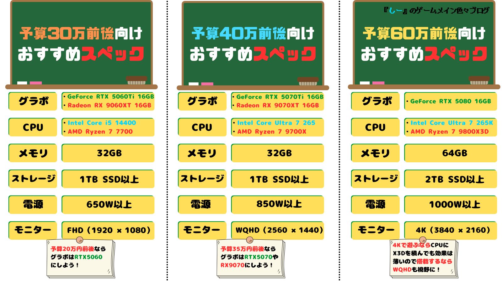 この価格帯のゲーミングPCはミドルスペックグラボの「RTX5060Ti 16GB」や「RTX5070」を搭載したモデルが標準となりますが、CPU次第ではミドルハイクラスの「RX9070XT」搭載モデルも購入出来るため、初めてのゲーミングPCにおすすめです。