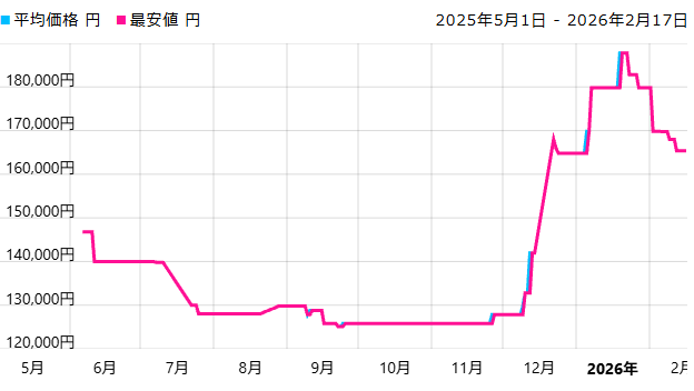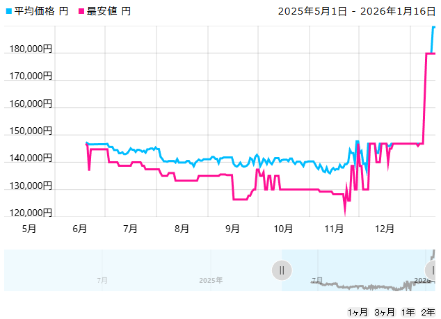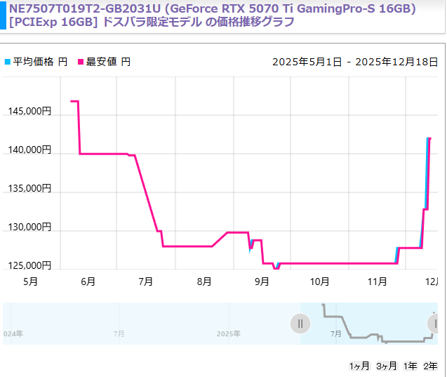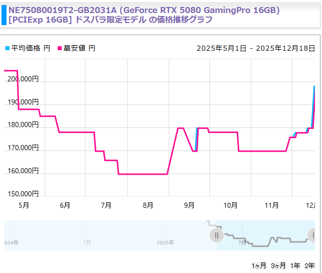 こちらもRTX5080同様、夏に入ってからどんどん安くなっていく一方で、12月に入ってから大きく価格が上昇しています。