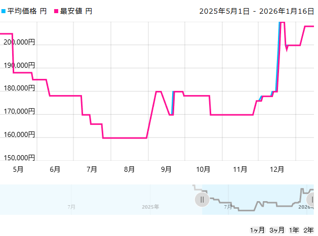 8月に最安値を付けて9月に入ってから価格が上昇していき、12月には更に高騰していることが分かります。