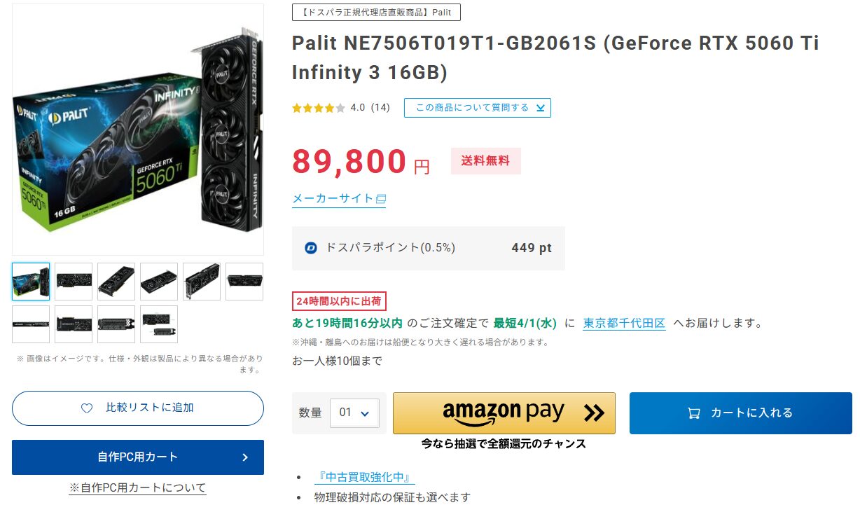 RTX5060TiはVRAM16GB版も発売されているため、生成AIなど幅広い用途で快適に使用が可能です。