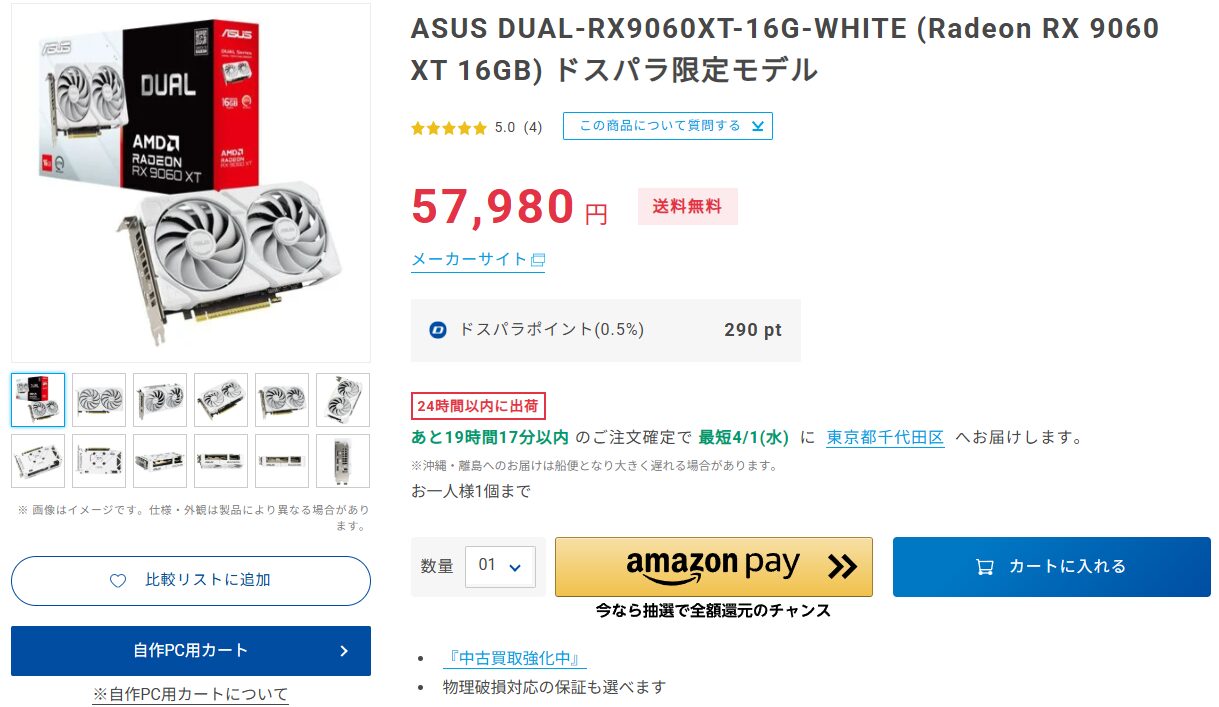 ただし、価格については同じ16GB版で比較するとRTX5060Tiの方が約3万円高く設定されており、コスト面ではRX9060XTが優位に立っています。