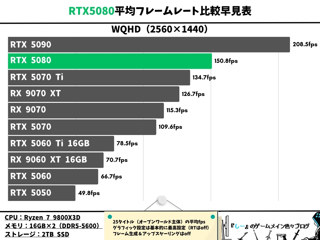 RTX5080の平均フレームレートを人気ゲーム25タイトルで検証し、RTX4080 SUPERやRTX4070Ti SUPERと比較して表にしました。