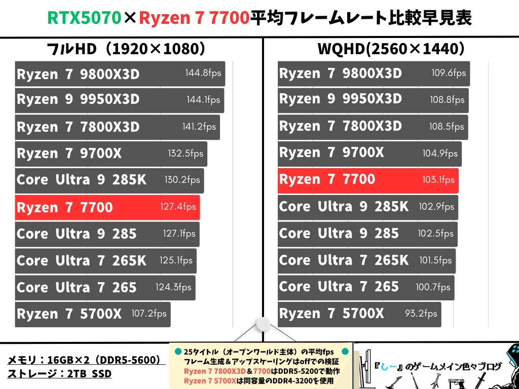 Ryzen 7 7700とRTX5070の組み合わせで人気ゲーム25タイトルの平均フレームレートを検証し、Ryzen 7 7800X3DやCore Ultra 7 265と比較して表にしました。