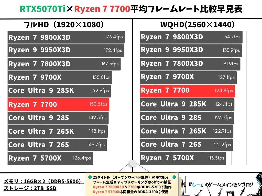 Ryzen 7 7700とRTX5070Tiの組み合わせで人気ゲーム25タイトルの平均フレームレートを検証し、Ryzen 7 7800X3DやRyzen 7 9700Xと比較して表にしました。