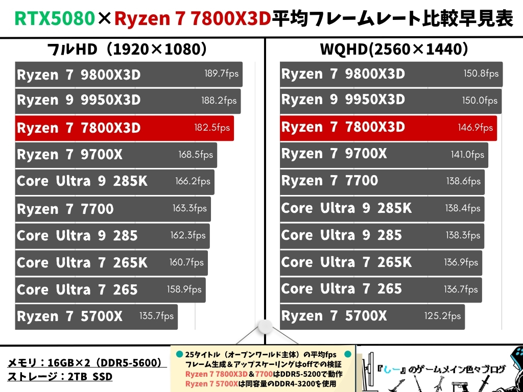 Ryzen 7 7800X3DとRTX5080の組み合わせで人気ゲーム25タイトルの平均フレームレートを検証し、Ryzen 7 9700XやCore Ultra 7 265Kと比較して表にしました。