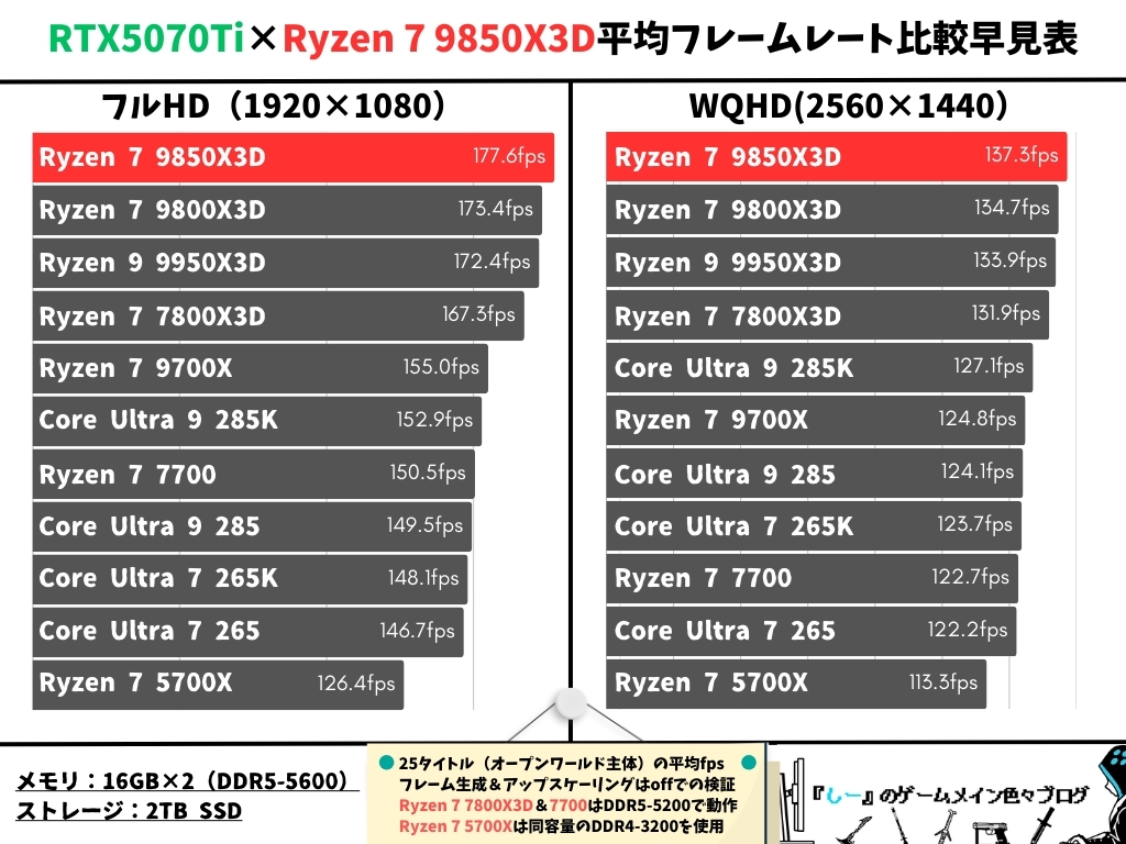 Ryzen 7 9850X3DとRTX5070Tiの組み合わせで人気ゲーム25タイトルの平均フレームレートを検証し、Ryzen 7 7 800X3DやCore Ultra 7 265Kと比較して表にしました。